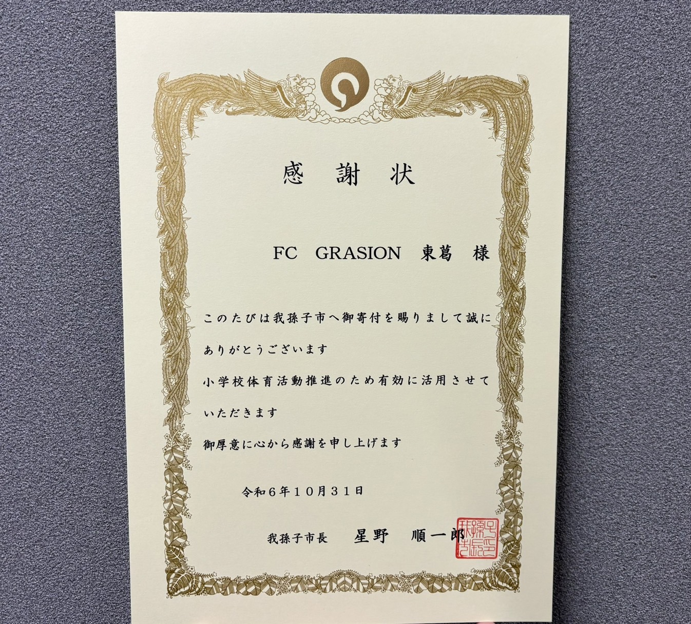 FC GRASION東葛 の理念を体現するため、星野順一郎市長様へ小学生用サッカーボールをお渡しさせていただきました。