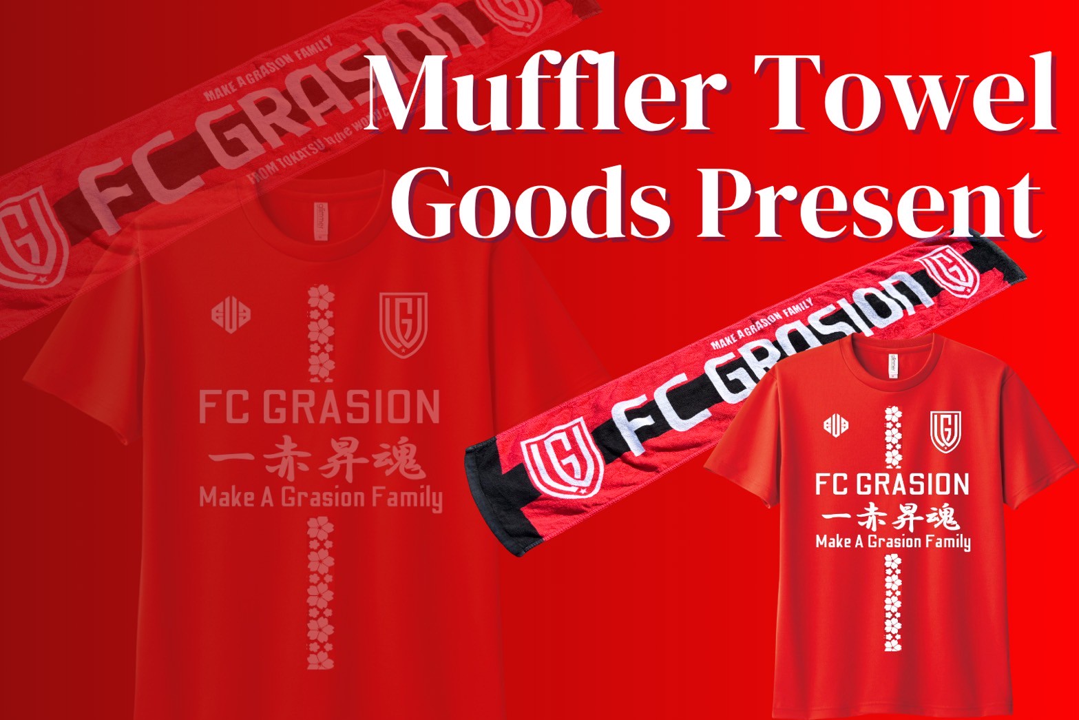 公式マフラータオル(入会時)/他公式グッズを1点をプレゼント(写真の商品とは限りません)。GRASIONグッズを身に纏い、熱い応援をお願いします。